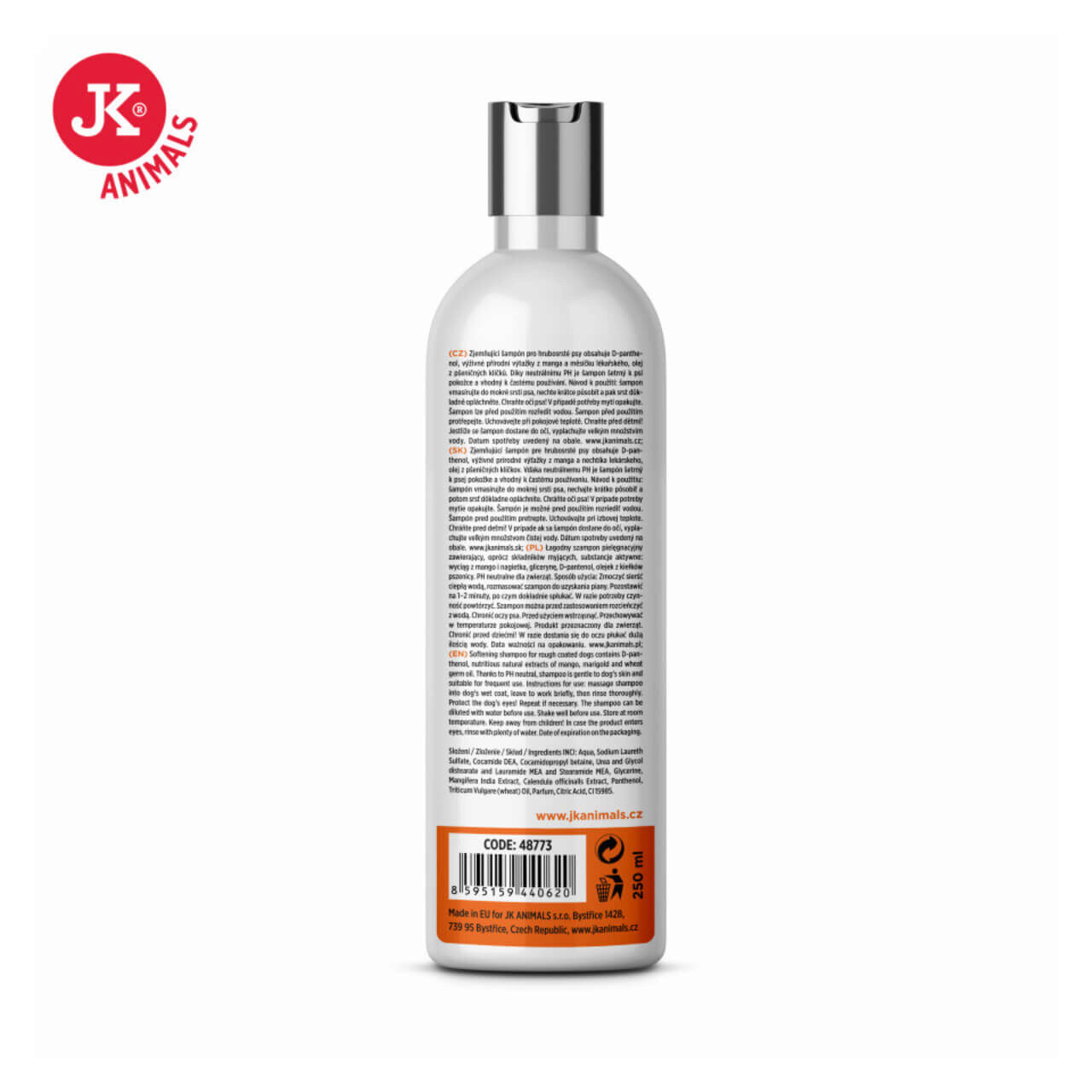 Samponul calmant pentru caini cu blana aspra, contine D-pantenol, extracte naturale hranitoare de mango si galbenele, ulei de germeni de grau.